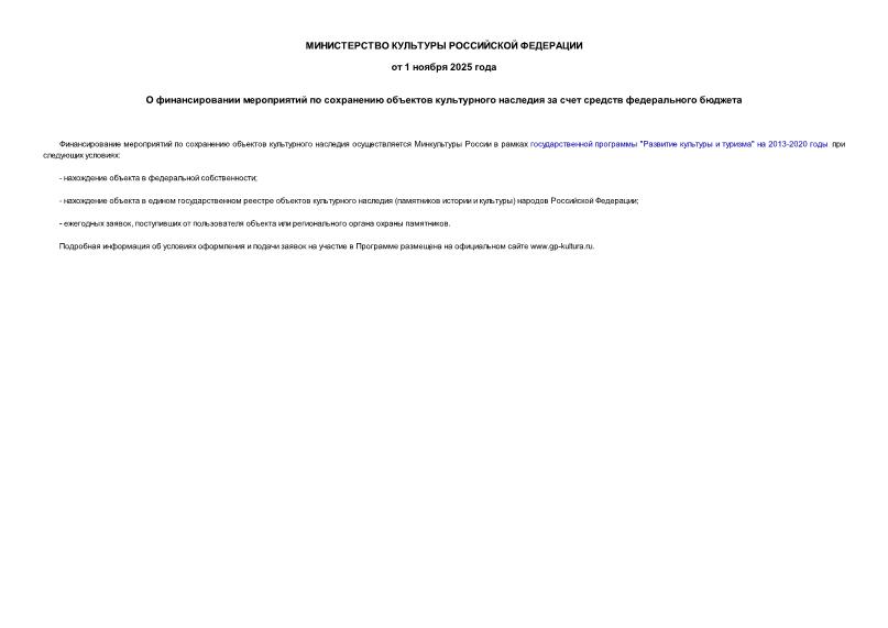 Статус: Информационный документ Текст документа: присутствует в коммерческой версии NormaCS Утвержден: Минкультуры России; Министерство культуры и массовых коммуникаций РФ, 01.11.2025 Обозначение: Информация Наименование: О финансировании мероприятий по сохранению объектов культурного наследия за счет средств федерального бюджета Дополнительные сведения: доступны через сетевой клиент NormaCS. После установки нажмите на иконку рядом с названием документа для его открытия в NormaCS